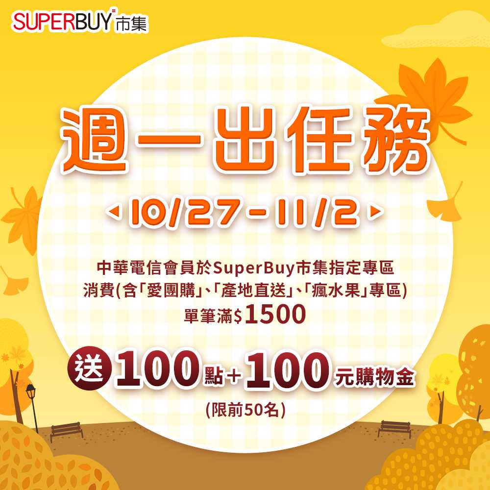 【週一出任務】10/27-11/2 於SuperBuy市集指定專區消費單筆滿$1,500送100點+100元購物金(限前50名)
