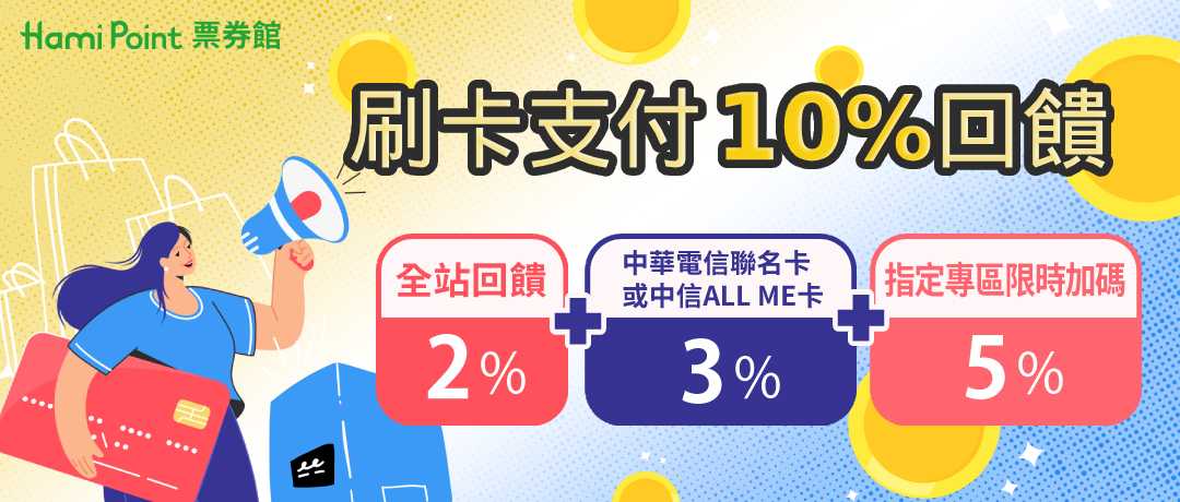 ●於Hami Point票券館刷中國信託ALL ME信用卡,最高可獲得 3% Hami Point回饋(回饋上限依信用卡回饋公告)
