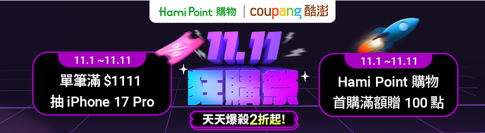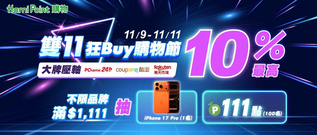 凡於114/11/1-114/11/11期間,凡於活動期間於 Hami購物 不限品牌單筆滿額$1111,即享抽 iPhone 17 Pro(1名)、111點(100名)資格。