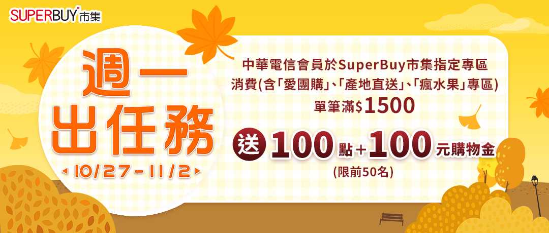 1.本活動限2025/10/27-11/2(含)期間透過「Hami Point官網或Hami Pay App」 前往「SUPERBUY市集」(含愛團購、產地直送、瘋水果專區)完成首次消費,單筆消費金額滿1,500,並經審核訂單符合導購資格及首購資格者,前50名贈100點+100元購物金。(原消費贈點外再加碼贈100點)